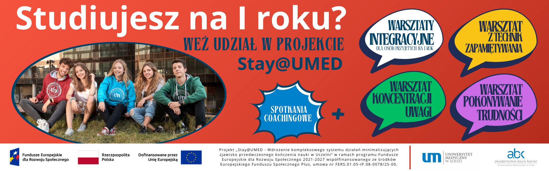 Zapraszamy Cię do uczestnictwa w projekcie Stay@UMED, którego jednym z założeń jest Twoja adaptacja i integracja z naszą uczelnią. Naszym celem jest wspieranie Cię w obszarze pokonywania trudności w nauce przez poszerzenie twoich kompetencji na proponowanych przez nas warsztatach i coachingu.
