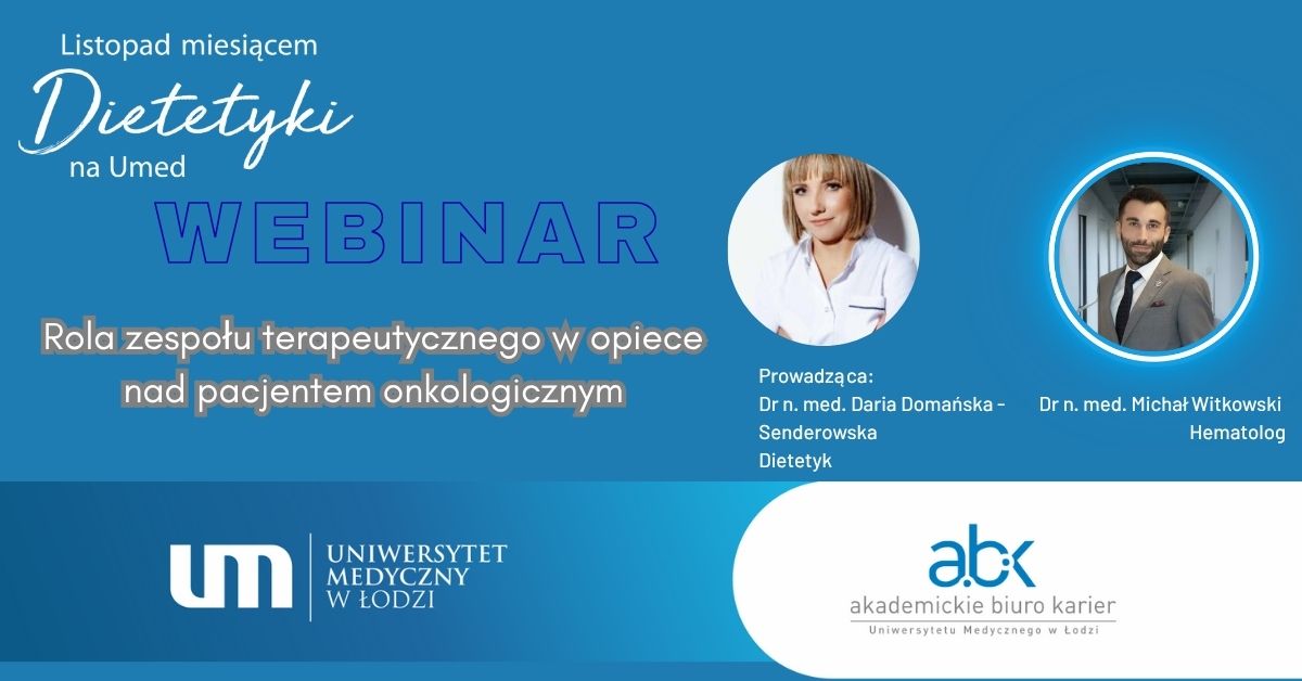 Webinar „Rola zespołu terapeutycznego w opiece nad pacjentem onkologicznym” to spotkanie łączące wiedzę medyczną i dietetyczną, prowadzone przez doświadczonych specjalistów – dr n. med. Michała Witkowskiego (onkolog-hematolog) oraz dr n. med. Darię Domańską-Senderowską (dietetyk kliniczny).