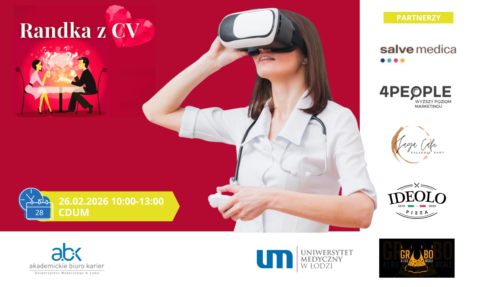 A w związku z tym… zabieramy Cię na randkę z karierą! 23–27 lutego zapraszamy na tydzień warsztatów i webinarów organizowanych przez Akademickie Biuro Karier we współpracy z tegorocznymi partnerami wydarzenia: 4People, Salve Medica, Ideolo Pizza, Albo Grubo, Jaga Cafe
